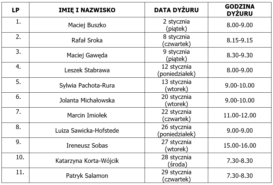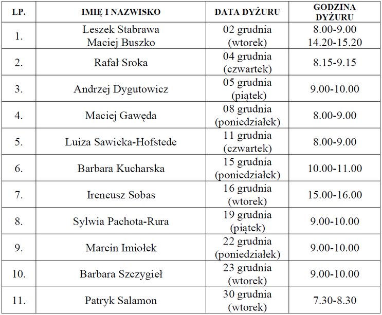 pełni dyżur 11 grudnia (czwartek) w godz. 13:00-14:00